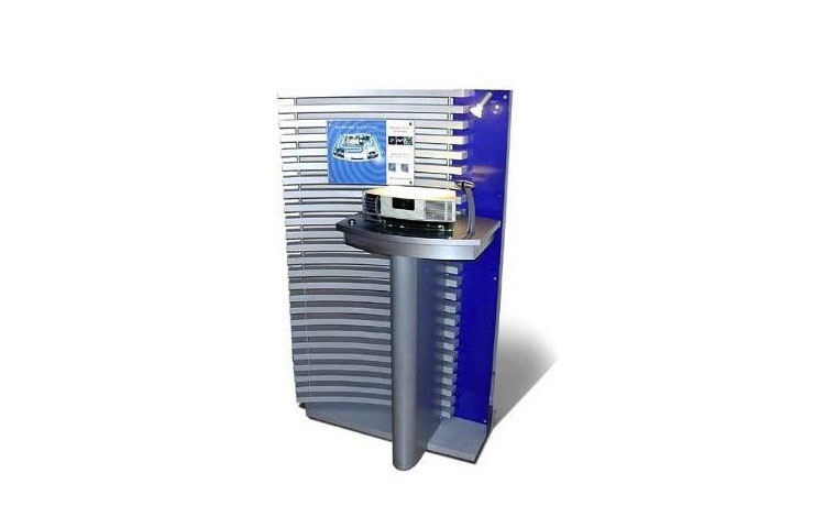 Interaktives Freestanding Display zur Präsentation eines kleinen aber sehr bassstarken Musiksystems.