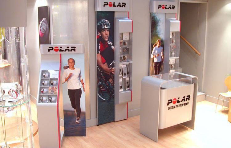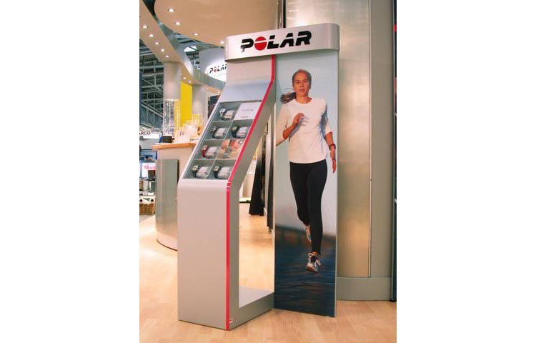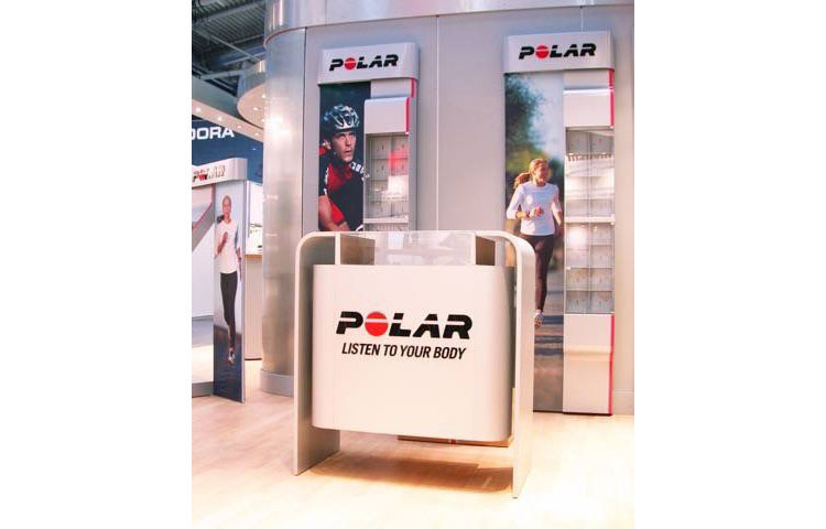 Gestaltung, Entwicklung und Produktion des modularen shop in shop Systems der Firma Polar. Zur Präsentation Pulsuhren wurde ein innovatives Konzept gestaltet und entwickelt.