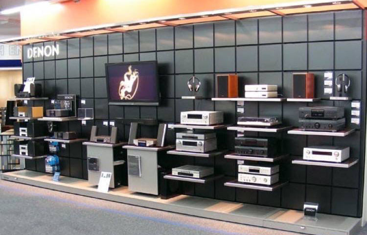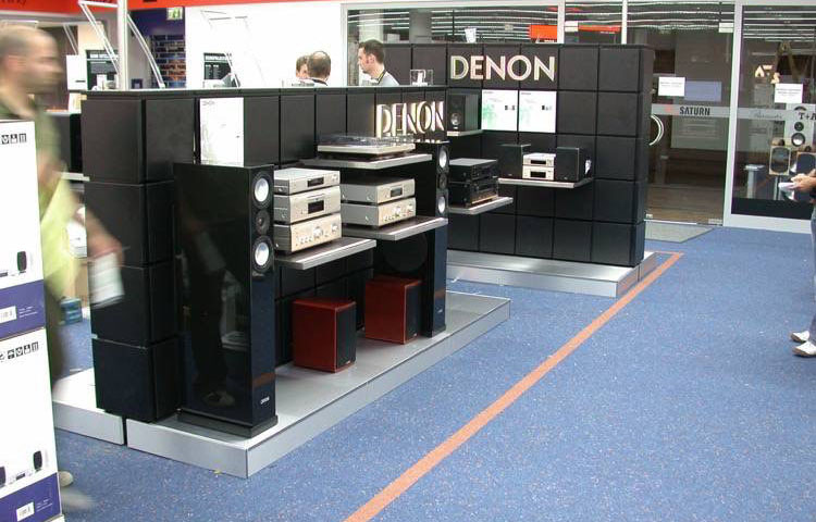 Gestaltung, Entwicklung und Produktion des modularen shop in shop Systems der Firma Denon. Das sehr hochwertige System bestand aus einer Kachelstruktur, welche das eigentliche Tragsystem hinter sich verbarg. Die gesamte Kabelführung konnte elegant in die Fugen der kacheln eingeführt werden. Sämtliche Regalböden verfügten über eine eingelassene LED Beleuchtung. Das System wurde europaweit im Handel eingeführt.