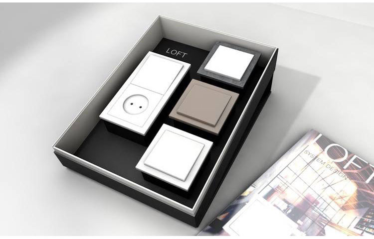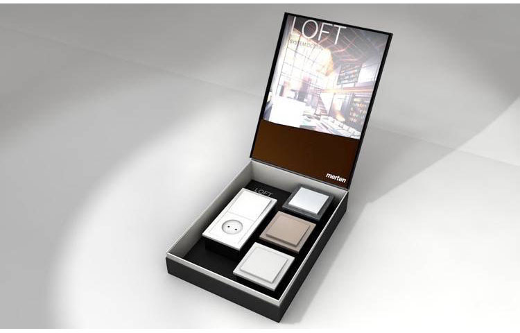 Zur Kundenpräsentation eines neuen Schalterprogramms wurden hochwertige Präsentationsboxen gestaltet und produziert. In diese konnten unterschiedliche Schaltermuster eingelegt werden.